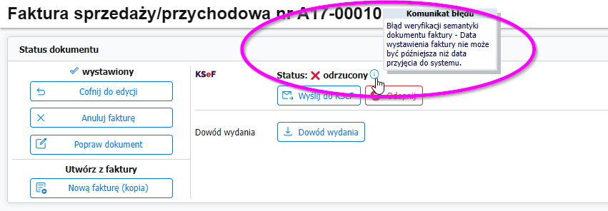 - Jeśli dokument zostanie oznaczony przez KSeF jako odrzucony – odczytaj przyczynę wskazując ikonę „i”