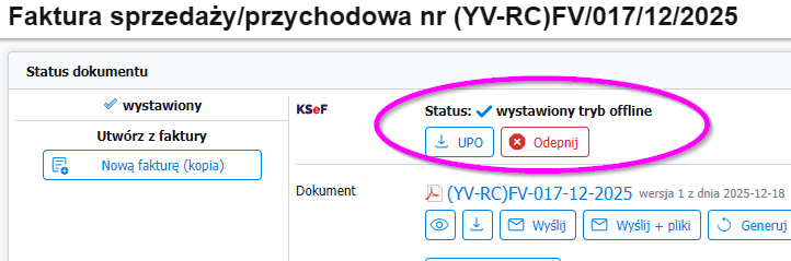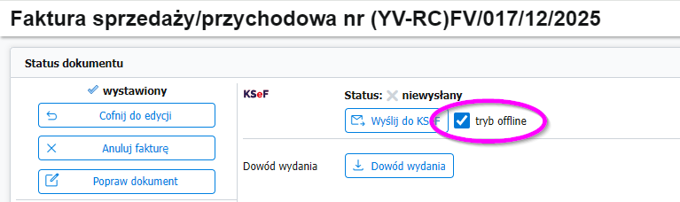 - Wyślij do KSeF – faktura otrzyma status wystawiony tryb offline