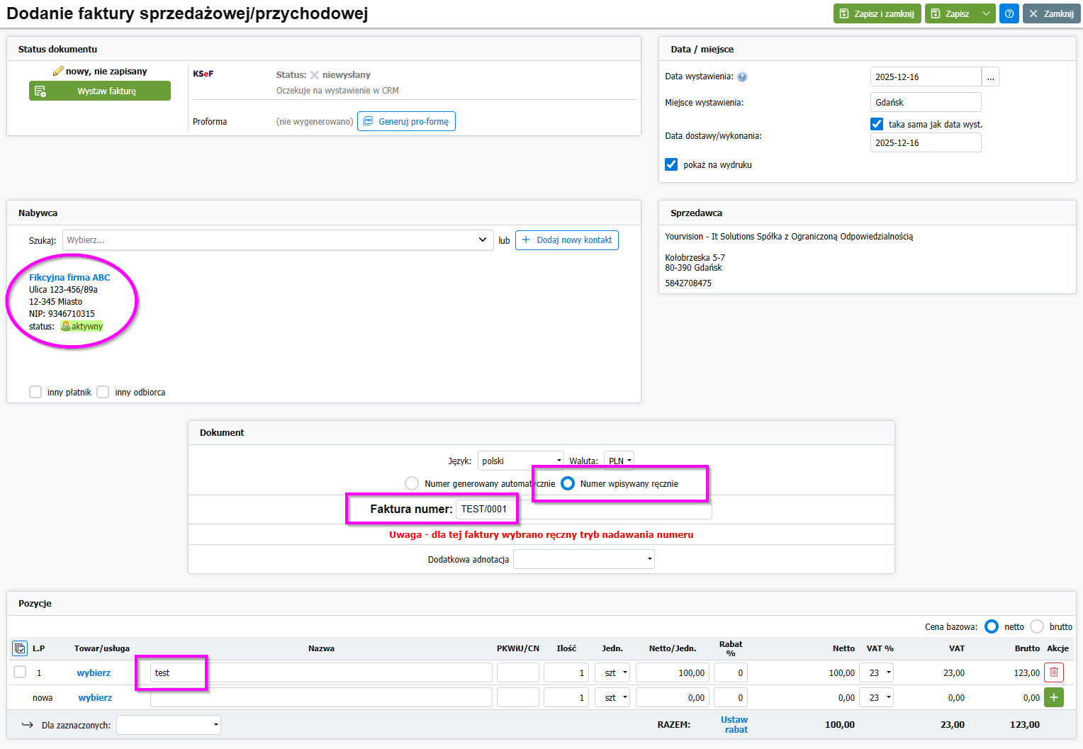 - Uwaga ❗ Na etapie testowania (KSeF DEMO – tryb przedprodukcyjny) – pamiętaj aby użyć fikcyjnych danych na fakturze.