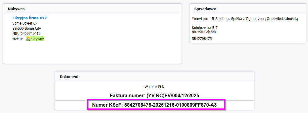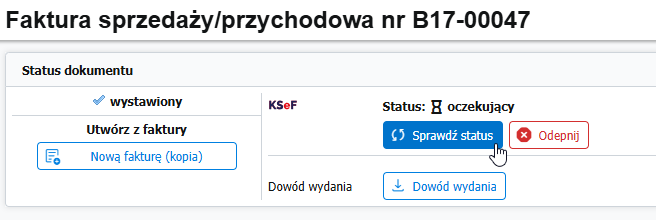 - Użyj przycisku Sprawdź status aby pobrać z KSeF aktualny status faktury.