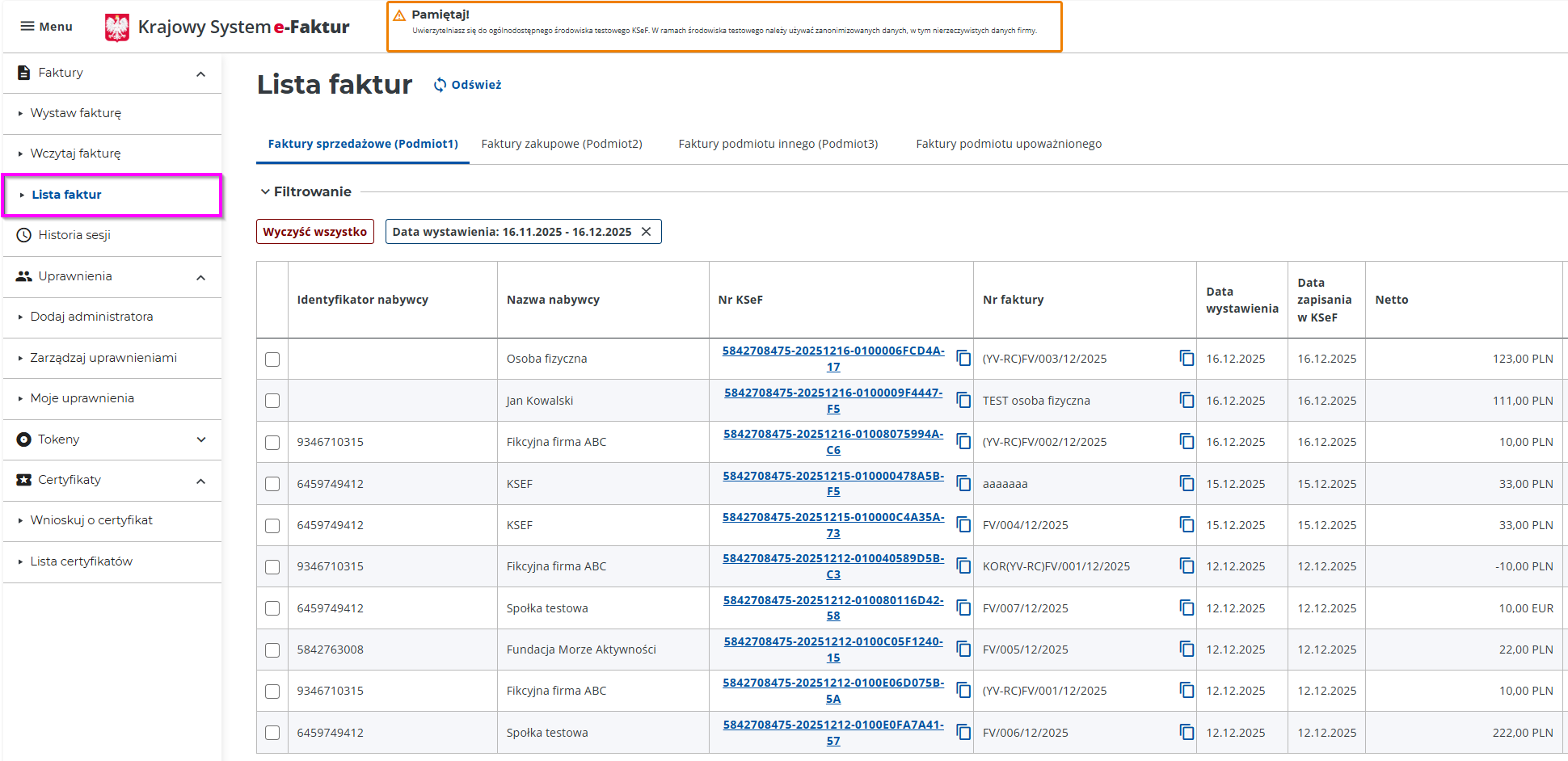 - Uwaga ❗ Na etapie testowania (KSeF DEMO – tryb przedprodukcyjny) – zalecamy użycie osobnej aplikacji do testów KSeF, aby oddzielić faktury rzeczywiste od testowych.