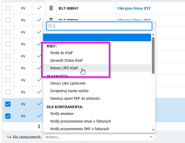 - Z poziomu listy faktur dostępne są hurtowe działania dla faktur KSeF